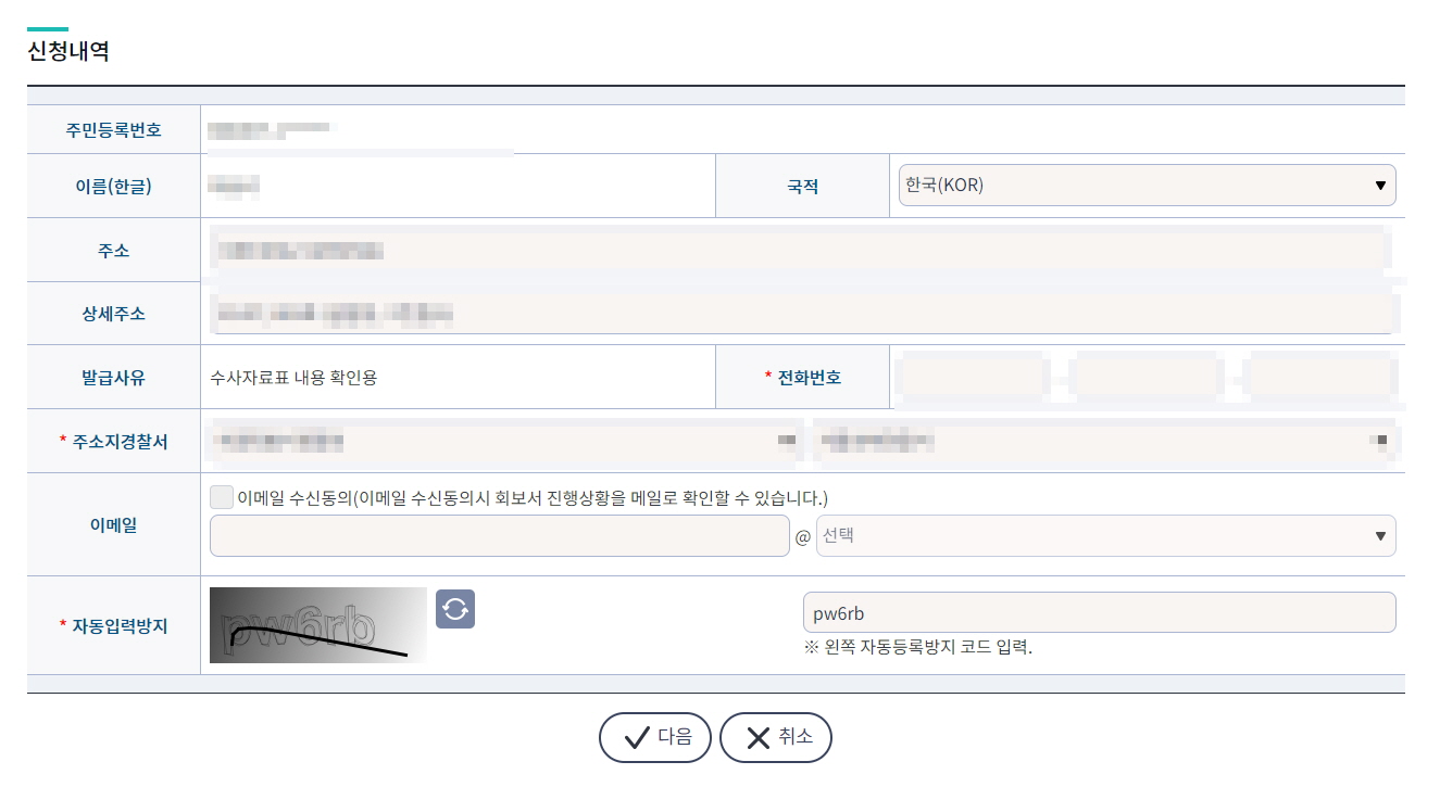 유의사항을 확인한 뒤 신청인 부분에 본인의 성함을 입력하고 다시 하단 부분에 "다음"을 클릭