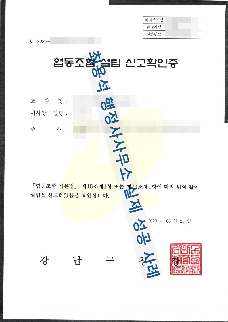 - 협동조합 설립 신고증 수령