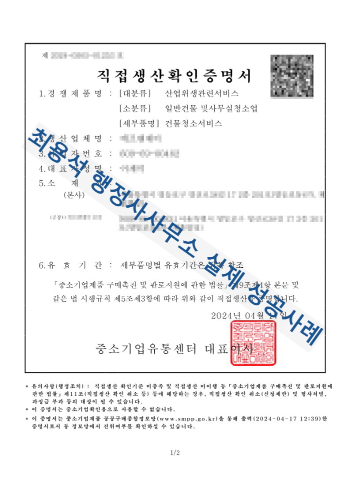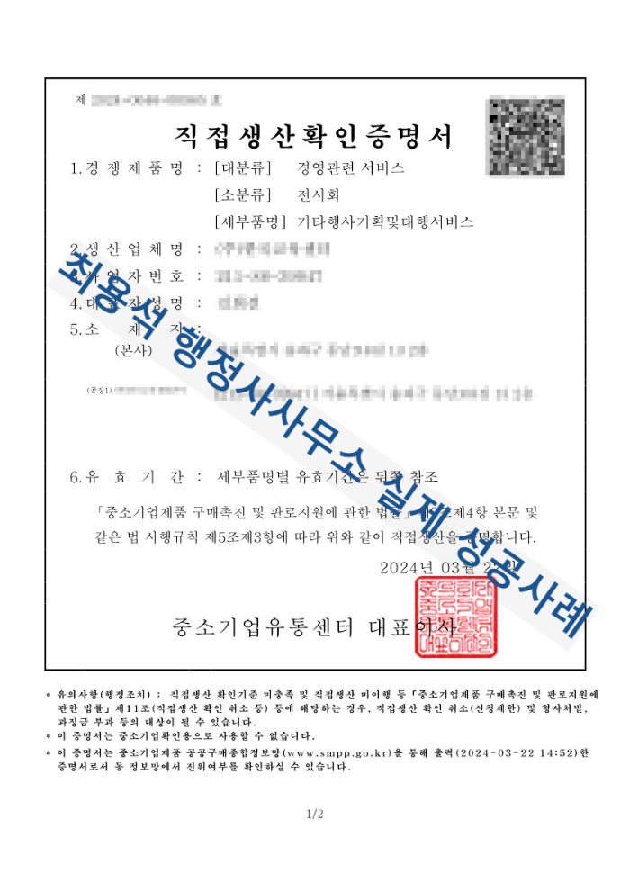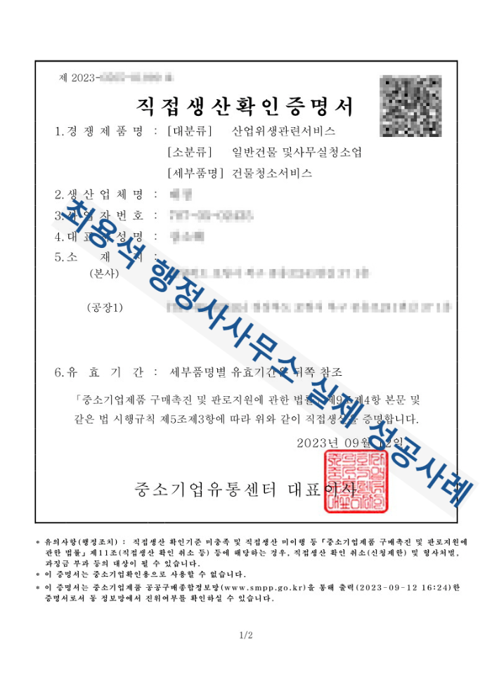 공공기관과 계약을 할 때 일정 금액 이상의 수의계약(1천만 원)이나 경쟁입찰 시 요구되는 서류 중 하나가 '직접생산확인증명서'입니다.