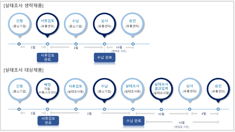 실태조사 생략 제품의 경우 근무일 기준 19일 이내, 실태조사가 진행되는 경우는 이보다 조금 더 소요될 수 있습니다.