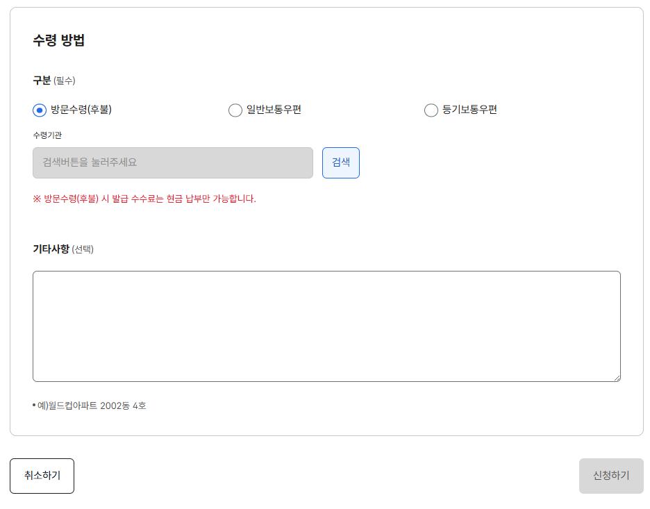온라인으로 신청시 600원, 직접 방문 수령 시에는 700원의 수수료가 부과됩니다.