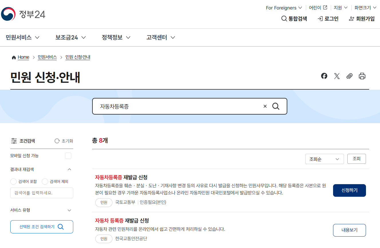 2. 상단 '민원신청안내' 클릭 후 '자동차등록증 재발급' 검색